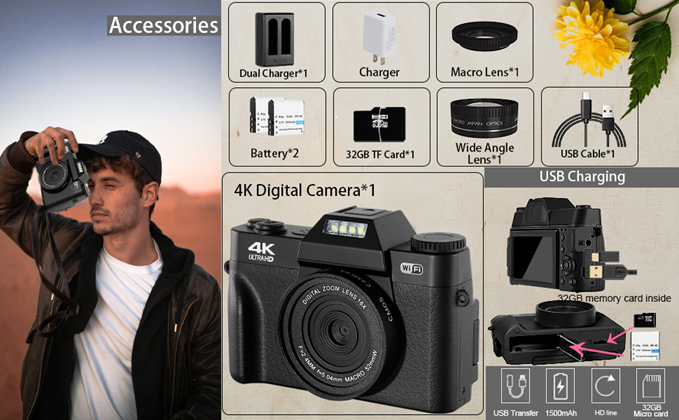 - ?Digital Camera for Photography ?: The 4k small digital camera with 30fps video resolution and 48 megapixel, provides a smooth shooting experience than 2.7K or 1080P video cameras, which can capture every excellent moment while vlog recording, the best camera for youtube. Equipped with wide angle & macro lenses and supports 16X Digital Zoom to get closer focus from far away and take close-up with clear details photos or recorder a wider range of scenery.