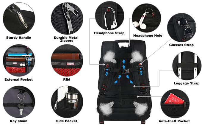 - USB CHARGING & WATER RESISTANT:External USB port with set-in charging cable offers convenient charging your cellphone and other electronic devices everywhere. A hole for headphone outside gives easy access to Earphone usage. The travel backpack made of water-resistant sturdy polyester fabric(long time soaking is not recommended), with heavy-duty locked zippers, which can withstand harsh conditions and heavy use. A rugged handle with steel cable on the top is easy for you to carry with one hand.