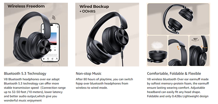 - 【80 Hours of Playtime】 V8 wireless headphones provide 80 Hours of playtime in Wireless mode, triple as much as other Wireless Bluetooth headphones.The over-ear headphones are compatible with all Bluetooth or 3.5mm plug cable enabled devices! fojep Bluetooth headset make them a great choice for anyone who wants to listen to music on the go.