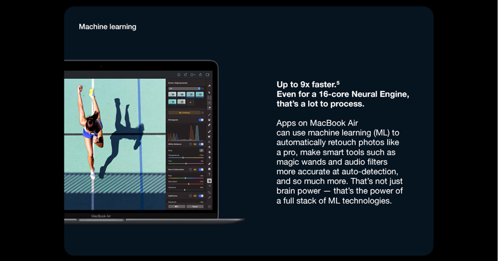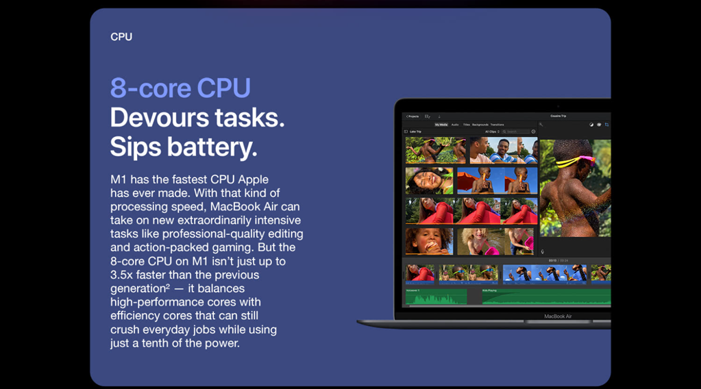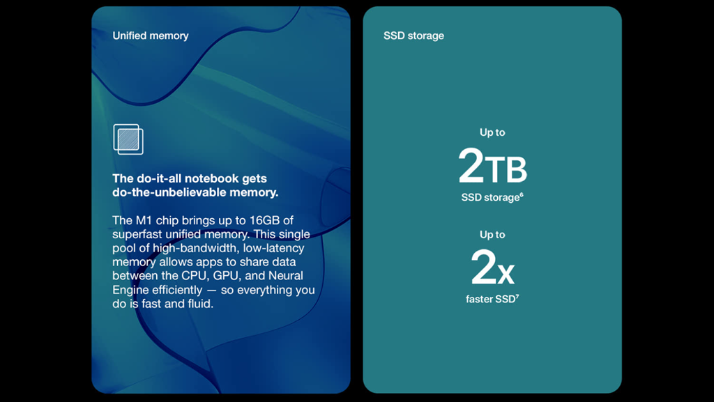 Processor | System on Chip (SoC) Apple M1 chip; 8-core CPU with 4 performance cores and 4 efficiency cores; 16-core Neural Engine |