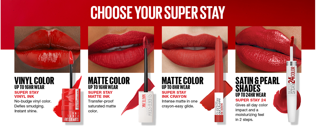 - Glossy Maybelline Superstay Vinyl Ink Liquid Lipstick: This longwear liquid cool red lipcolor delivers no-budge vinyl color and up to 16 hour wear, featuring our Color Lock formula that defies smudging and transfer; Simply shake and swipe