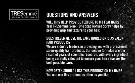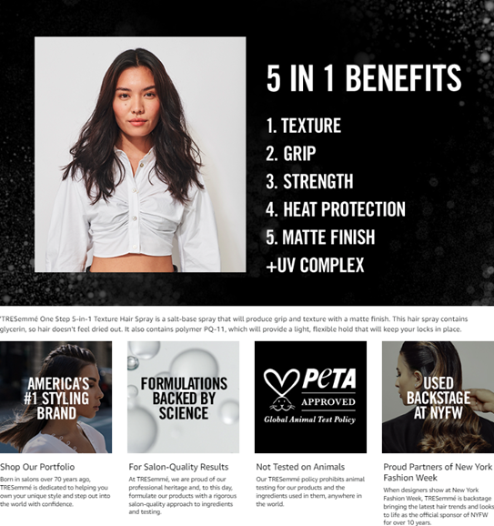 How to attain your hair goals in ONE SIMPLE STEP? With so many hair products on the market, TRESemmé One Step 5-in-1 Texture Mist makes your styling routine easier by providing 5 benefits in one step! TRESemmé One Step 5-in-1 Texture Mist is a salon-quality hair mist that will produce grip and texture with a matte finish. This salt-based hair texture spray contains glycerin, so your hair doesn't feel dried out. Our multitasking hair mist helps add texture, grip, strength, and head protection with a matte finish. This texture styling spray provides a light, flexible hold that will keep your locks in place. How to use this hair care product: Spritz this leave in hair treatment onto damp or dry hair. Air dry, diffuse or lightly blow-dry. We've always understood that style is more than a look: it's a part of you. With our professional quality care, a world of style possibilities is yours to achieve. Every choice we make at TRESemmé, from the values we promote-such as not testing on animals and being PETA-approved-to the stylists we work with, down to the carefully selected ingredients we use, are made with intention and inspired by the latest trends and style. Because 70 years on, we believe in the power of style. So tell your story, land that job, make your mark – and achieve your aspirations with confidence. With TRESemmé, your style can match your ambition.