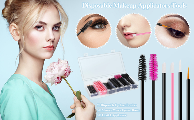 【Suit】Disposable makeup applicators tools kit include 70 pcs disposable eyeliner brushes (35 yellow+35 white), 100 pcs mascara wands (50 black+50 rose red), 100 pcs lipstick applicators (50 black+50 pink), sufficient quantity for your daily makeup needs.