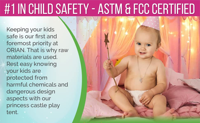 - #1 IN CHILD SAFETY – ASTM & FCC CERTIFIED Keeping your kids safe is our first and foremost priority at ORIAN. That is why we designed our kids playhouse tent by the strike standards of the American Society for Testing and Materials, which helps to ensure that only quality, raw materials are used. Rest easy knowing your kids are protected from harmful chemicals and dangerous designs aspects with our princess castle play tent.