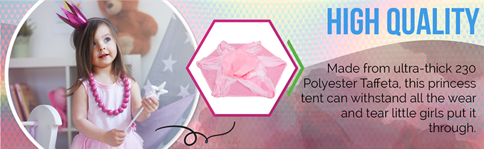 - HIGH QUALITY, DURABLE DESIGN – Made from ultra-thick 230 Polyester Taffeta, this princess tent for kids with lights can withstand all the wear and tear little girls put it through. This material is compatible for both indoor playhouse and kids outdoor playhouse, and will last for years of fun and enjoyment!