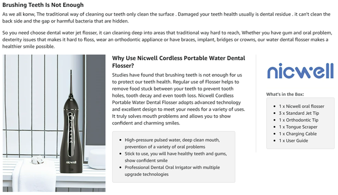 POWERFUL BATTERY LIFE & IPX7 WATERPROOF: With powerful and environmental lithium battery, fully charged need 4 hours and used continuously for about 21 days. Come with USB Cable(Adapter Not Included) applicable to a variety of charging equipements such as power bank, computer, laptop.... With double-sealing rings, Nicwell oral irrigator prevent water leakage reliably, can use for shower in the bathroom and it's washable to clean