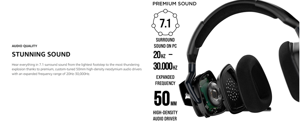 Immerse yourself in the action with the Corsair void RGB Elite wireless, with custom-tuned 50mm neodymium audio drivers delivering 7.1 surround sound on the PC. Microfiber mesh fabric and memory foam ear pads provide lasting comfort. Connect to your PC or PS4 with a low-latency 2.4GHz wireless connection, with a range of up to 40ft and all-day battery life up to 16 hours. An omnidirectional microphone with LED mute indicator ensures that you're heard with exceptional vocal clarity. The void RGB Elite's distinctive design and durable construction are complemented by fully customizable RGB lighting on each ear cup. Powerful Corsair iCUE software ties everything together, enabling full control over equalizer settings, 7.1 surround sound, RGB lighting and more.