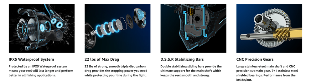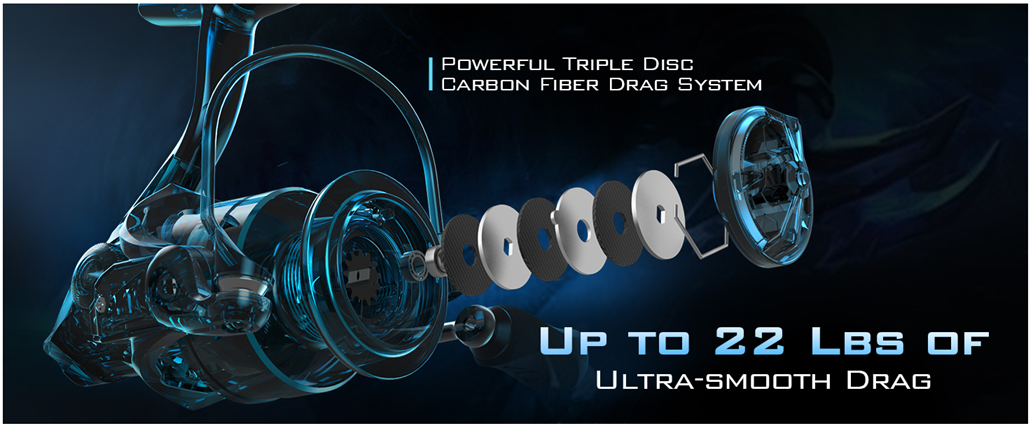 • SMOOTH OPERATION - You will love Spartacus II spinning reel's ultra-smooth, reliable 22 lbs of triple disc carbon fiber drag that allows you to use light fishing lines, oversized stainless-steel main shaft, and strong metal gears for more durability.