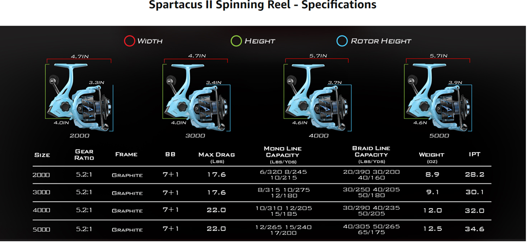• HIGH END LOOKS and PERFORMANCE - With a sophisticated color scheme including stryker green, chartreuse and black with a sure grip EVA knob Spartacus II is a standout and a lightweight workhorse. Gear ratios are 5.2 for the 2000, 3000, 4000 and 5000 with performance that you would expect from a much more expensive brand.
