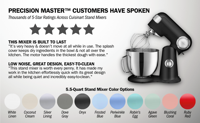 Delivering power, precision and performance, our newest stand mixer features a 500-watt motor, die-cast metal construction, and 12-speeds that allow for nuance and excellence in performing a variety of preparation tasks. The unit's tilt-back head allows for easy access to its 5.5-quart mixing bowl, while the included splash guard prevents messy countertops. Also included are a chef's whisk, dough hook, and flat mixing paddle. The mixing bowl and all accessories are dishwasher safe, and the stand mixer is available in ruby red, white linen, onyx, periwinkle blue, robin's egg, and silver lining. Additionally, you can purchase a variety of attachments for the unit: a pasta roller and cutter, pasta extruder, meat grinder, frozen dessert maker, and spiralizer.